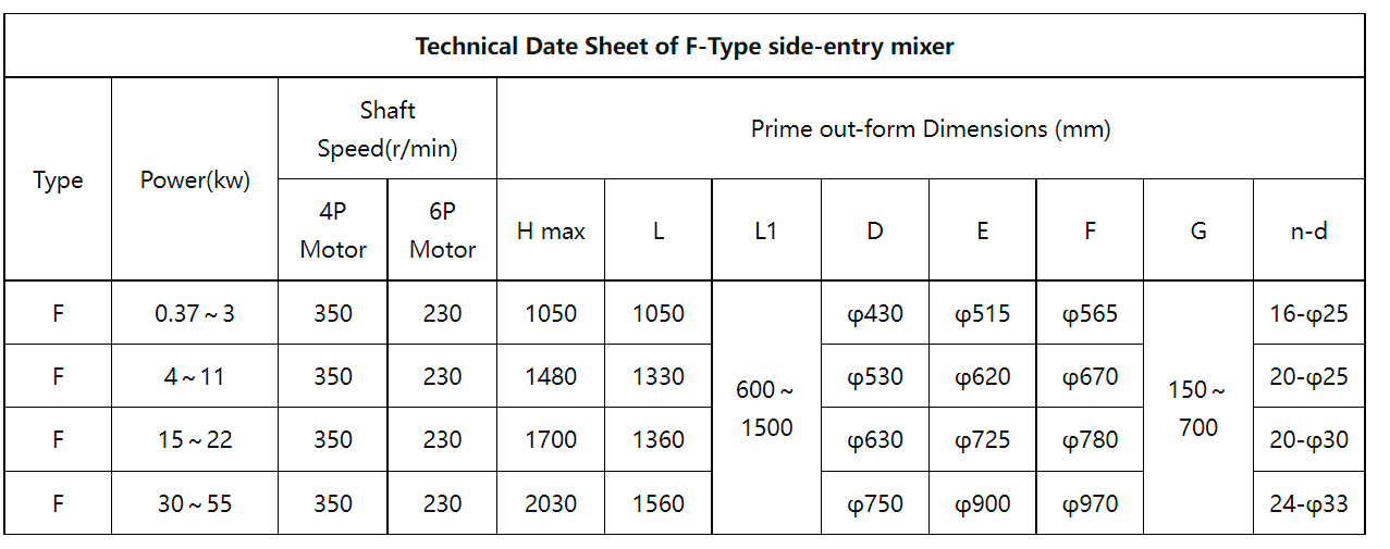 Мешалка с боковым входом типа F может быть установлена в нефтяном баке, баке для смазки, баке для топлива, баке для парафина, баке для асфальта (для тяжелого резинового асфальта, базового нефтяного битума, асфальта марки А) и в некоторых резервуарах для хранения присадок и других сред, которые нужно помешать.